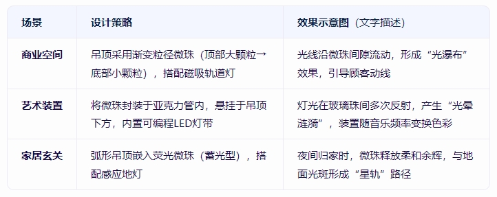 嵌入式裝飾:將微珠混合于樹脂或透明膠中,澆筑成立體浮雕吊頂,光線穿透時形成光影流動效果。